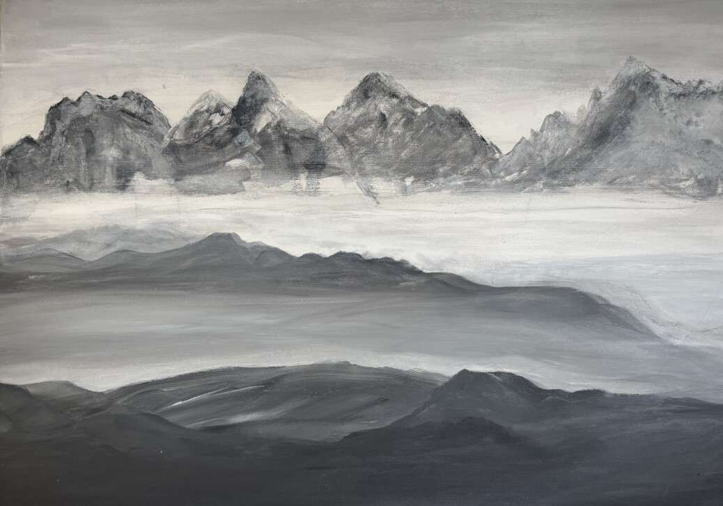 Eine beeindruckende Darstellung von Bergketten, die in Nebel und Licht getaucht sind. Die monochrome Farbpalette aus Grautönen verleiht dem Werk eine zeitlose Eleganz und unterstreicht die Erhabenheit der Landschaft. Die Gipfel ragen still in den Himmel, majestätisch und unerschütterlich.